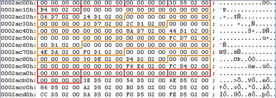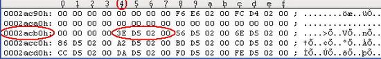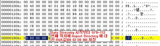 해당 파일이 메모리로 로드되게 되면 위 디스크 상에서 3E D5 02 00 를 포함하고 있던 TunkTableRVA 2D0B4 가 로더에 의해서 다음과 같이 덮어쓰여짐을 알 수 있다.