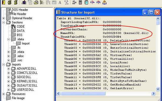 예를 들어 위의 예에서 첫번째 IMAGE_IMPORT_DESCRIPTOR의 4번째 필드인 NAME은 RVA 00 02 D5 30h 를 가지고 있는데 이를 실질적인 옷셋으로 변환하려면 아까 찾아낸 RVA와 RAW 옷셋과의 차이값인2400h를 빼게 되면 실질적인 위치 2B130h를 얻게 된다.