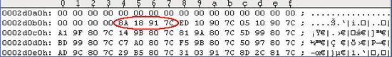 첫번째 IMAGE_IMPORT_DESCRIPTOR의 5번째 필드의 RVA 00 02 D0 B4h 를 마찬가지로 Raw 옵셋으로 변환하게 되면 2ACB4h 가 얻어지는데, 이것이 바로 4바이트 크기의 IMAGE_THUNK_DATA구조체를 가리키는 옵셋이며, IAT 이다.