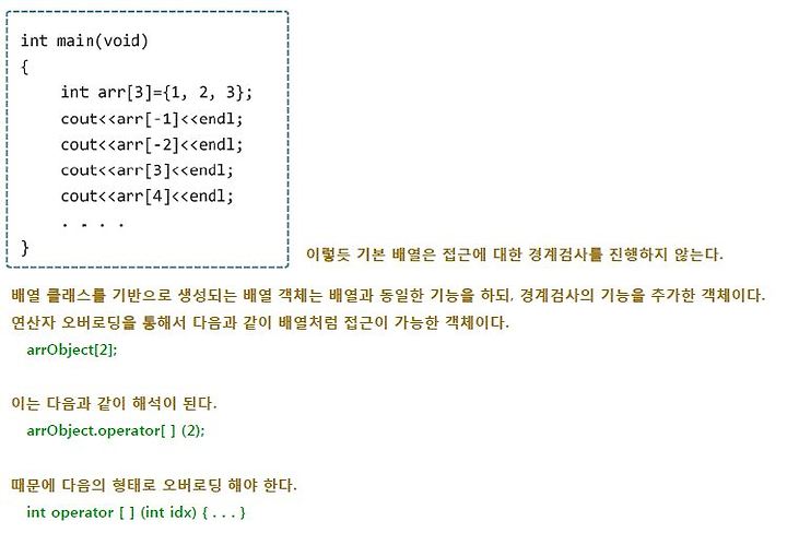 일반적인 배열은 접근에 대한 경계검사를 진행하지 않기때문에 경계검사 기능을 추가하여 오버로딩한다.