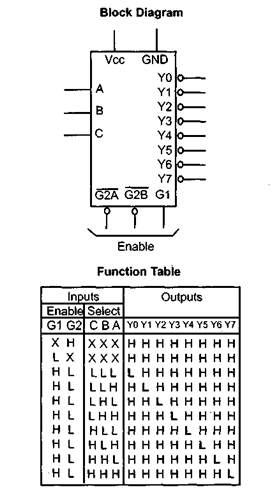 각 핀의 동작을 살펴보면, G1에 어떤 값이 오든지 G2가 H 값이면 Y0 ~ Y7 은 모두 H가 된다.