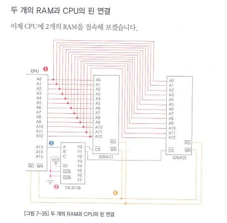 ③ CPU의 A13핀에 74LS138의 A에 연결되어 있으며, 74LS138의 Y0은 6264(1)의 /CS 핀에 연결되어 있고,